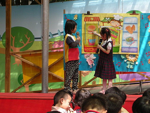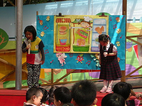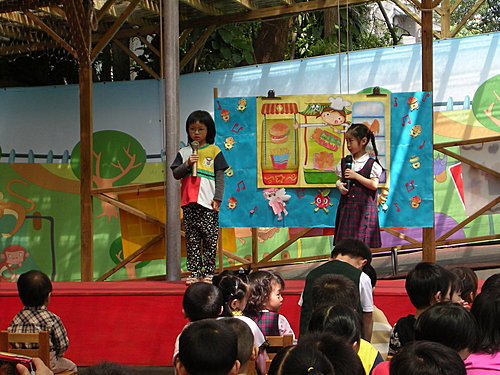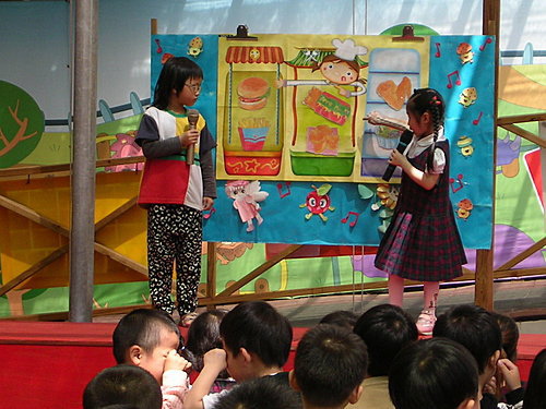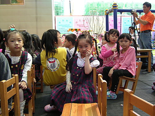 等待中,先照一張 輪到三寶上台,一點也不會怯場喔還會用英文問同學,真的很佩服幼稚園老師,可以把小朋友教的這麼棒下台一舉恭,掌聲鼓勵